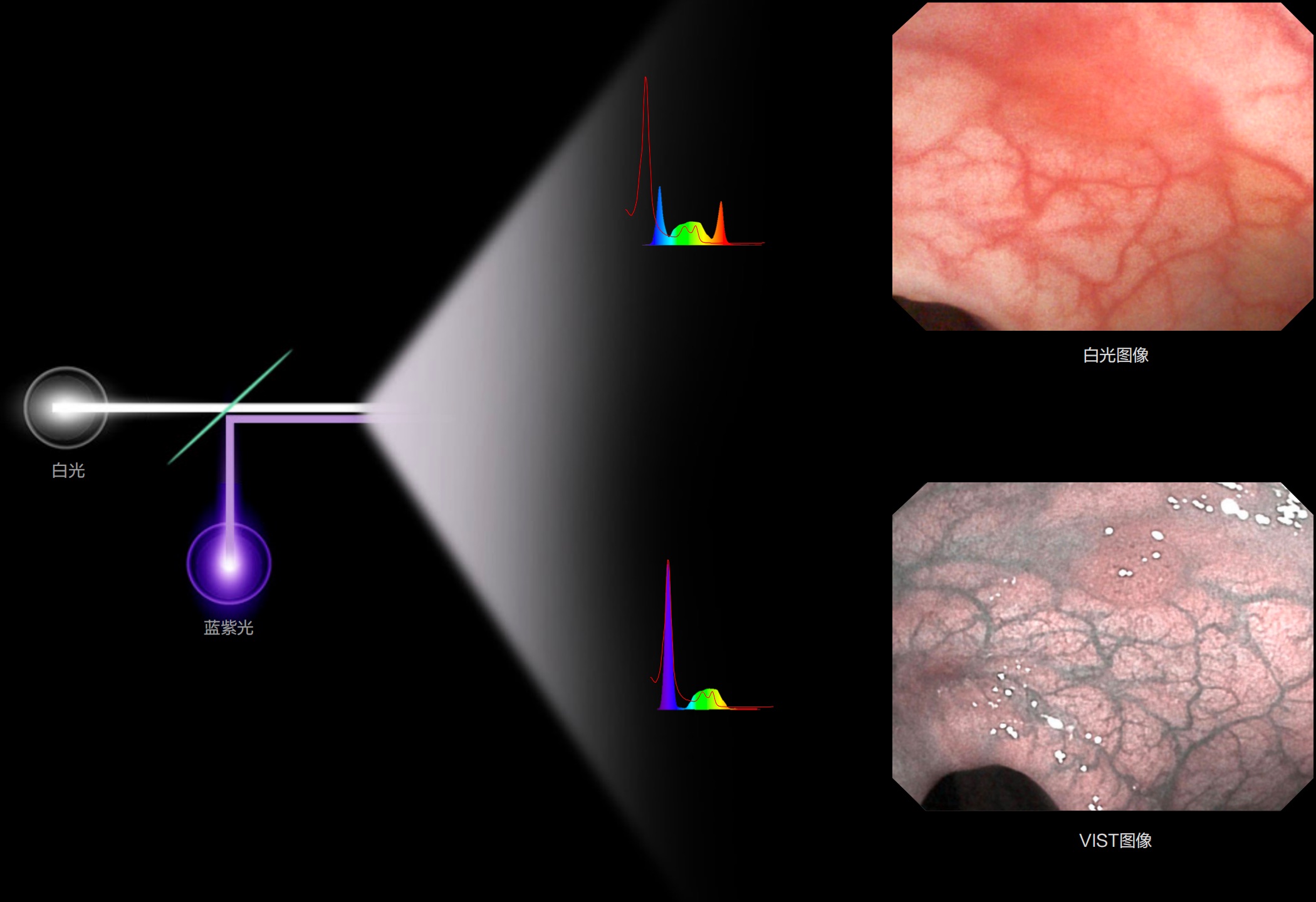 利用了血红蛋白在不同波长吸收下系数不同的原理,设计的一种光学域滤波和数字域滤波结合的染色技术,既保证了图像亮度,又可增强黏膜血管的对比度,充分凸显早期病变的细微结构变化,为临床疾病的观察诊断提供更丰富的参考信息。